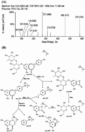 As shown in Table 1, three flavonoid aglycones (naringenin, kaempferol, and apigenin), and twelve flavonoid-O-glycosides (mainly flavonoid-7-O-glycosides, including naringin, hesperidin, neoeriocitrin, et al.) were identified in the ECG extract. Retro Diels-Alder (RDA) reactions were common in the MS fragmentation of flavonoids [,]. In the case of naringin, the signal at m/z 459 and 119 could be explained by cleavage of bonds 1 and 3 in the C ring. The fragment ion at m/z 313 and 151 were yielded by the neutral loss of a rhamnose moiety and subsequent neutral loss of a glucose moiety from the ion at m/z 459. The characteristic ion at m/z 271, which was proposed as deprotonated naringenin, was formed by the successive neutral loss of a rhamnose and a glucose moiety from naringin. An RDA reaction related the cleavage of bonds 1 and 3, and deprotonated naringenin also gave the fragment ion at m/z 151 and 119. Meanwhile, as a result of the cleavage of bond 5, the product ion at m/z 177 and 93 was generated from deprotonated naringenin. The product ion spectra and proposed fragmentations of deprotonated naringin were shown in Figure 1. Besides the twelve flavonoid-O-glycosides above, three flavonoid-C-glycosides (vicenin-2, lucenin-2,4′-methyl ether, and luteolin-6-C-glucoside) were also detected. A loss of 120 Da (C4H8O4), which was proposed as a fragment of glucose moiety, was detected in these three flavonoid-C-glycosides. However, the neutral loss of glycoside moiety was only identified in the fragmentation of luteolin-6-C-glucoside. Different from flavonoid-O-glycosides, RDA reactions were not observed in these flavonoid-C-glycosides. These results indicated that the glycosides bonding with carbon atoms exert a greater impact on structural characteristics of flavonoid-glycosides than that when bonding with oxygen atoms.