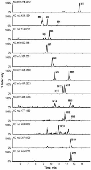 As for hesperetin, eriodictyol, and apigenin, probably due to little ingestion, several metabolites were identified. Co-chromatography with an authentic standard established that M14 was hesperetin-3′-O-sulfate. According to a study carried out by Brand and co-researchers [], hesperetin was mainly conjugated at positions 7- and 3′-OH, and hesperetin-3′-O-sulfate was eluted earlier than hesperetin-7-O-sulfate. Thus, M15 could be tentatively identified as hesperetin-7-O-sulfate. Compared with reference standards, M16 and M17 were definitely identified as hesperetin-7-O-glucuronide and hesperetin-3′-O-glucuronide, respectively. Similar to the fragmentation pattern of naringenin glucuronides, the hesperetin glucuronides produced two major characteristic ions via the loss of the glucuronyl moiety (giving an ion of m/z 301) or the aglycon hesperetin (giving an ion of m/z 175), respectively. Following the loss of respective ligand (glucuronide or sulfate), M18 and M19 both gave characteristic fragments at m/z 151 and 135, which were proposed as the products of Retro Diels-Alder (RDA) reactions. With reported results [], M18 and M19 were identified as eriodictyol-O-glucuronide and eriodictyol-O-sulfate, respectively. However, it is difficult to assign the specified conjunct sites of ligands for these two metabolites due to the four binding sites of eriodictyol (5-, 7-, 3′-, and 4′-OH). Based on an early report [], M20 was tentatively identified as apigenin glucuronide. Nevertheless, given three hydroxyls on the apigenin skeleton, M20 could be tentatively identified as the 5-, 7-, or 4′-glucuronide.