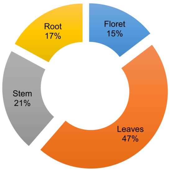 The concentrations of chlorophyll a in florets, stems, and leaves were 852, 144, and 4478 µg/g DW, whereas the concentration of chlorophyll b was 135, 23, and 781 µg/g DW, respectively (Table 2). In this study, the broccoli leaf and floret tissues contained about 5–7 times of chlorophyll a than of chlorophyll b, which is higher than the previous data evaluated with four broccoli varieties [32]. The different result may reflect the ratio of broccoli flower buds and stems included in sampling protocols, as well as differences in environmental conditions between the two studies [33,34].