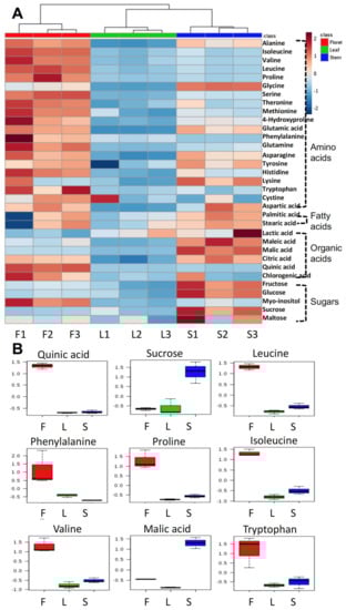 Primary metabolites in different tissues of broccoli (amino acids, fatty acids, organic acids, and sugars) in heatmap (A) and the top nine selected biomarkers based on variable importance in projections (B); F, L, and S indicate floret, leaf, and stem, respectively. The number after each tissue code (F, L, or S) indicates biological replication.