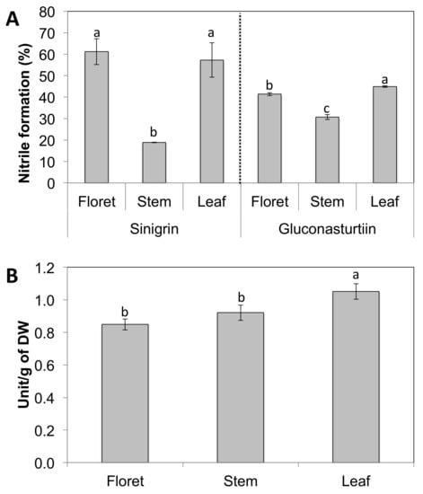 Nitrile formation is shown as the relative ratio of nitrile to the total hydrolysis product formed (sum of isothiocyanates and nitriles). Data are presented as the mean concentration ± standard deviation (n = 3). Different letters above the error bar indicate significant differences between different tissues within the same glucosinolate substrate by Student’s t-test at p ≤ 0.05. One unit was defined as 1 μmol of hydrolysis products of glucosinolates released per min.