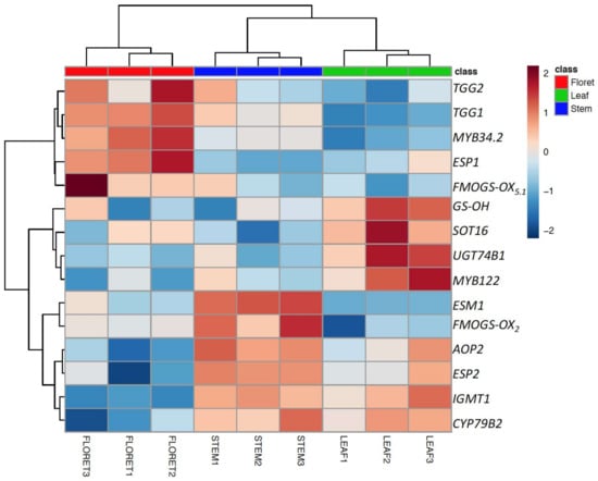Top 15 significantly expressed genes (glucosinolate biosynthesis, myrosinase, cofactors genes) among the different broccoli tissues. The gene expression values were normalized based on mean value of floret and then transformed to logarithmic scale.