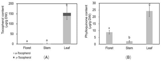 Vitamin E consists of four tocopherols and four tocotrienols, of which α- and γ-tocopherols are the predominant compounds in broccoli, red sweet pepper, carrot, and vegetable oils [37,38]. There was a significant difference in tocopherols among different tissues of broccoli (Figure 5A). The concentration of total tocopherols was 1.57, 1.97, and 155 µg/g DW in floret, stem, and leaf, respectively, and α-tocopherol accounted for 0, 100, and 90.4% of total tocopherols of each tissue. Among different broccoli tissues, leaf was the highest in α- and γ-tocopherols.