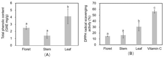 Total phenolic content (gallic acid equivalent (GAE) mg/g DW) (A) and 2,2-diphenyl-1-picryl-hydrazyl-hydrate (DPPH) antioxidant activity (B) in different tissues of broccoli extract (12.5 mg DW/mL of 70% methanol). Vitamin C was used as positive control (125 µg/mL).