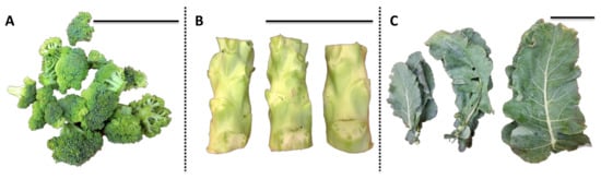 Representative image of various broccoli tissues for one biological replication. The black scale bar at the right upper corner of each picture is 10 cm. (A) Broccoli floret; (B) broccoli stem; (C) broccoli leaf.