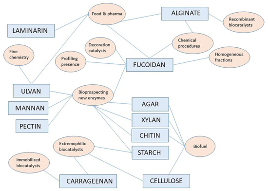 Figure 1 above provides a pictorial summary of the current research topics/fields on specific polymers as indicated in paragraphs in this review, from the most important reference works and original articles found here. The interdisciplinary nature of the current interest in marine polysaccharides and marine carbohydrate-hydrolyzing enzymes is evident. A number of interesting original articles are found in the active research field related to bioprospecting marine agarases, marine chitinases and xylanases probably reflecting the ongoing successes in the understanding their machinery for bond cleavage and more and more oriented practical applications, especially in the biofuel domain or for the production of small oligosaccharides of pharmaceutical interest. Among biochemical characteristics worth noting, operativity under alkaline condition and solvent stability are the most appreciated.