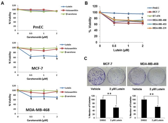 2.1. Lutein Selectively Inhibits the Growth of Human Breast Cancer Cells