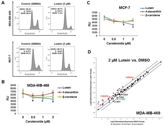 2.2. Lutein Induces Cell Cycle Arrest in Human Breast Cancer Cells