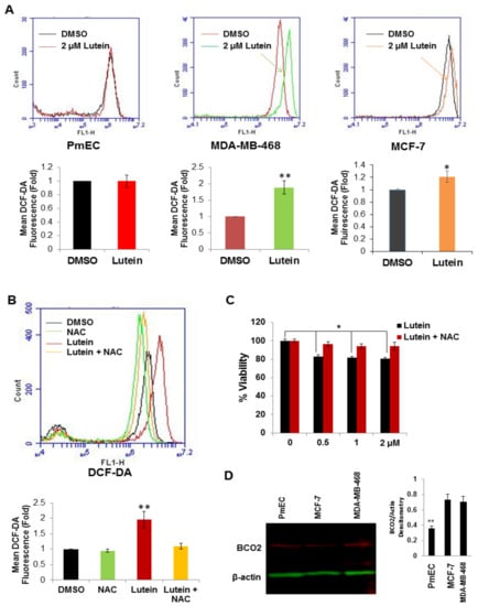 2.4. Lutein Selectively Increases Intracellular ROS Production in Human Breast Cancer Cells