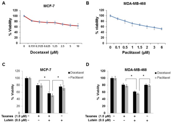 2.5. Lutein Enhances the Cytotoxic Effects of Chemotherapeutic Taxanes in Human Breast Cancer Cells