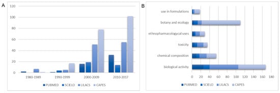 A survey of the databases PubMed, Scielo and Lilacs identified about 200 papers covering “barbatimão” species (S. adstringens, S. obovatum, S. polyphyllum and S. rotundifolium, including synonyms), and more than 200 Master and PhD Theses in Brazil were found in CAPES. After the year 2000, the number of publications about Stryphnodendron spp. known as “barbatimão” increased about 10-fold and twice in journals indexed in PubMed after 2010 (Figure 1A). Most of the publications were related to the biological properties of the species, mainly for the treatment of internal and external infectious and inflammatory diseases, but also for wound and ulcerative wound healing related to the astringent and cicatrization properties, highlighting the ethnopharmacological attributes of the species. Demonstrating the ethnopharmacological use of a plant requires well-conducted scientific studies correlating the plant results with a well-established standard [1]. Attention should be payed to studies of biological activity with inconclusive data, which, while not confirming ethnopharmacological use, can be a step in the right direction [16]. To that end, the Brazilian Pharmacopeia and Government have amassed the efforts of recognized scientific institutions and internationally published papers to enable proper identification of “barbatimão” species, their active chemical constituents, and their therapeutic uses according to the proven efficacy of the species [17,18,19].