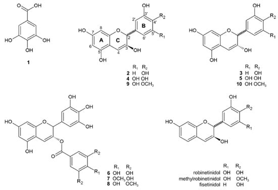Prorobinetinidins were further purified from the ethyl acetate fraction by first subjecting it to CC using Sephadex LH-20, and then main subfractions were subjected to MLCCC (ethyl acetate:n-propanol:water, 35:2:2, v/v) and HPLC (reverse-phase C18). Therefore, robinetinidol-(4β→8)-epigallocatechin and robinetinidol-(4α→8)-gallocatechin were purified using HPLC and a methanol:acetonitrile:water (3:1:16, v/v/v) system, while robinetinidol-(4α→8)-epigallocatechin was purified using a methanol:water (21:79, v/v) system. The other prorobinetinidins were purified using a gradient system of methanol:water at 28–30% (robinetinidol-[4β→6(8)]-gallocatechin and robinetinidol-(4β→8)-epigallocatechin-3-O-gallate) and 25–30% (robinetinidol-(4α→6)-gallocatechin, robinetinidol-(4α→6)-epigallocatechin, and robinetinidol-(4α→8)-epigallocatechin-3-O-gallate) [69]. Subjecting different subfractions to MLCCC allowed the purification of 4′-O-methylrobinetinidol-(4α→8)-4′-O-methylepigallocatehin, 4′-O-methylgallocatechin, 4′-O-methylrobinetinidol-(4α→8)-4′-O-methylgallocatehin, gallocatechin, and epigallocatechin [54].Purification of the dimer 4′-O-methylgallocatechin-(4α→8)-4′-O-methylgallocatechin followed the same purification path: after extraction with acetone:water, the subfraction was partition using CC with ethyl acetate and water, and one of the subfractions from the MLCCC process produced the molecule that was identified by chemical shifts using 1H-NMR and 13C-NMR [54,70].