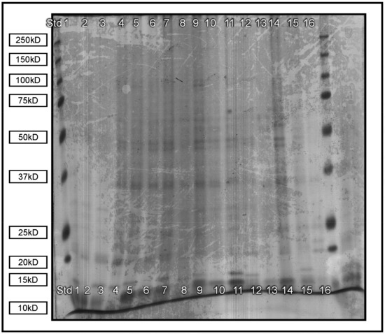 - Laemmli, U.K. Most commonly used discontinious buffer systems for SDS electrophoresis. Nature 1970, 277, 680–685. [Google Scholar] [CrossRef]