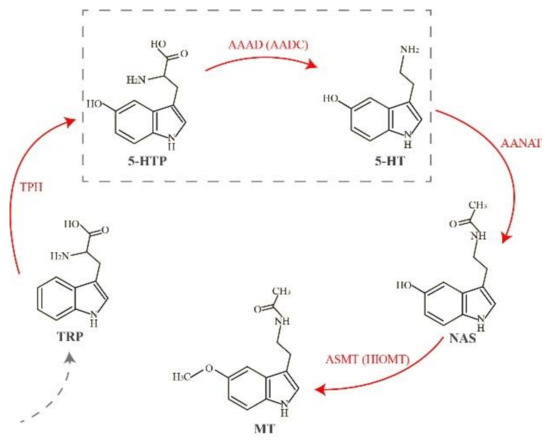 The classical pathway of melatonin biosynthesis in vertebrates. Red arrows emphasize the four melatonin synthetases. The dashed box marks the main step involved in our present study. Abbreviations: AAAD, l-aromatic amino acid decarboxylase; AANAT, aralkylamine N-acetyltransferase; ASMT: acetylserotonin-O-methyltransferase; 5-HT, 5-hydroxytryptamine; 5-HTP, 5-hydroxytryptophan; MT, melatonin; NAS: N-acetylserotonin; TPH, tryptophan hydroxylase; TRP, tryptophan.