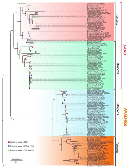 A phylogenetic tree based on 151 extracted nucleotide sequences in vertebrates. Red and orange shaded brackets marked AAAD and AAAD-like lineages, respectively. Bootstraps higher than 60% are displayed. Red dots indicate bootstraps ≥90%; blue hexagons represent bootstraps ≥75% and <90%; green squares stand for bootstraps ≥60% and <75%.