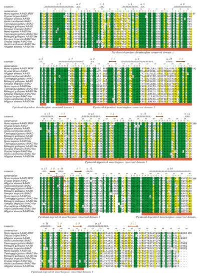 To further analyze AAAD protein structures, we downloaded a common human AAAD protein model (PDB ID: 3RBF) from the Protein Data Bank (PDB). Representative sequences from medaka (Oryzias latipes), Chinese alligator, green anole (Anolis carolinensis), zebra finch (Taeniopygia guttata), turkey (Meleagris gallopavo), and tropical clawed frog (Xenopus tropicalis) were chosen to align with the human AAAD protein model. TEXshade [49] was applied to colorize the alignment results.