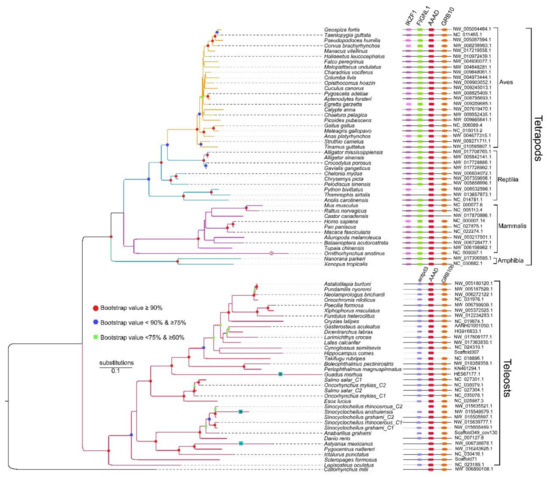 We collected a total of 151 aaad nucleotide sequences from 77 genomes of vertebrates, including 10 mammals, 23 birds, 10 reptiles, two amphibians, and 32 fish species (Table 1). Accession numbers of these genomes are provided in Table S1. Corresponding protein sequences of AAADs contained around 480 amino acids (aa) each, which is consistent with the data reported by other investigations [20,21].
