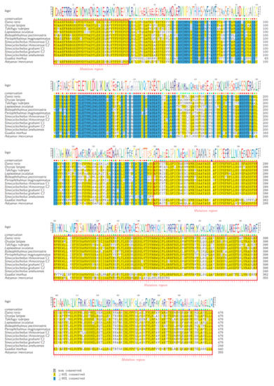 Combining the results of phylogenetic analysis with synteny identification, we focused on several representative species with special living habitats and important evolutionary nodes, including zebrafish, medaka, fugu (Takifugu rubripes), spotter gar (Lepisosteus oculatus), BP, PM, Atlantic cod, Mexican tetra, and three Sinocyclocheilus species (cave-restricted Sa, semi-cave-dwelling Sr, and surface-dwelling Sg). We implemented a multiple-sequence alignment in MEGA (version 7.0) with the Muscle module between examined species and zebrafish. Codon-based alignment was performed to cover the whole open reading frame (ORF), and the irregular ORF shifts for possible pseudogenes were identified. Missing exon region(s), codon frameshift(s), or premature stop codon(s) within each gene were considered as potential pseudogenization.