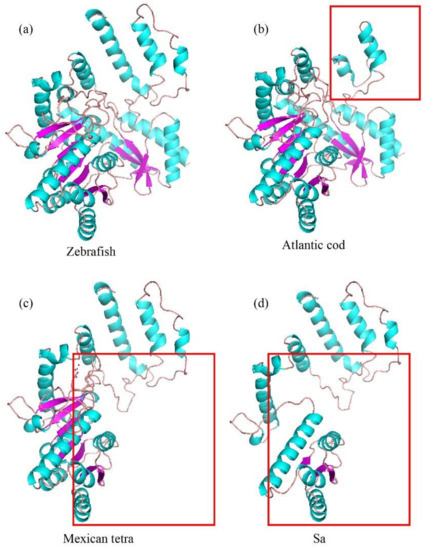 Predicted 3D structures of AAADs structures among zebrafish (a), Atlantic cod (b), Mexican tetra (c), and Sa (d). Red boxes indicate the amino-terminal or carboxyl-terminal deletions.