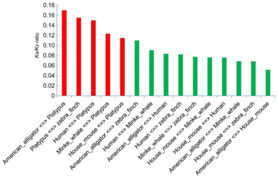 To understand AAAD substitution changes in tetrapods, we chose six representative organisms, including American alligator, zebra finch, platypus, human, minke whale, and house mouse, to compare their substitution rate changes within AAAD encoding sequences. These sequences formed, in total, fifteen pairs according to pairwise combination, and we calculated the Ka, Ks, and Ka/Ks within each pair of them using DnaSP (version 5.0, University of Barcelona, Barcelona, Spain) [51].