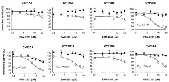 EAM-2201 at a concentration of 50 µM negligibly inhibited CYP1A2-mediated phenacetin O-deethylation, CYP2A6-mediated coumarin 7-hydroxylation, CYP2B6-mediated bupropion hydroxylation, CYP2C8-catalyzed amodiaquine N-deethylation, CYP2C9-catalyzed diclofenac 4′-hydroxylation, CYP2C19-mediated [S]-mephenytoin 4′-hydroxylation, CYP2D6-mediated bufuralol 1′-hydroxylation and CYP3A4-mediated midazolam 1′-hydroxylation activities in human liver microsomes (Figure 2).