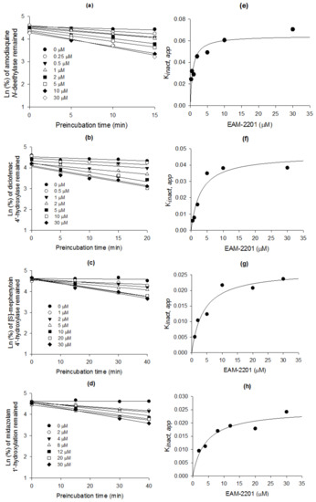 Inactivation kinetics of (a) N-desethylamodiaquine formation from amodiaquine; (b) 4′-hydroxydiclofenac formation from diclofenac; (c) 4′-hydroxy-[S]-mephenytoin from [S]-mephenytoin; and (d) 1′-hydroxymidazolam from midazolam in human microsomes by various concentrations of EAM-2201. Relationship between kobs and EAM-2201 concentrations to estimate kinact and Ki values for (e) CYP2C8-mediated amodiaquine N-deethylation; (f) CYP2C9-mediated diclofenac 4′-hydroxylation; (g) CYP2C19-mediated [S]-mephenytoin 4′-hydroxylation; and (h) CYP3A4-mediated midazolam 1′-hydroxylation.