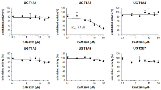 The inhibitory effects of EAM-2201 on the activities of six uridine 5′-diphospho-glucuronosyltransferases (UGT) enzymes in ultrapooled human liver microsomes. The cocktail UGT substrate concentrations were as follows: 0.5 µM SN-38 for UGT1A1, 2 µM chenodeoxycholic acid for UGT1A3, 0.5 µM trifluoperazine for UGT1A4, 1 µM N-acetylserotonin for UGT1A6, 0.2 µM mycophenolic acid for UGT1A9 and 1 µM naloxone for UGT2B7. The data are presented as the mean ± SD (n = 3).
