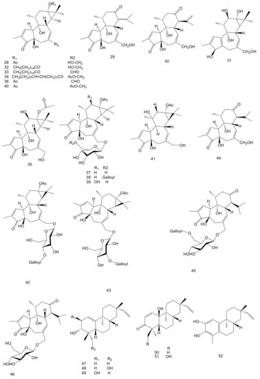 Diterpenoids are the major components of E. fischeriana. According to the literature, almost 90 diterpenoids have been isolated from the roots of this plant since the 1970s. Types of diterpenoids include ent-abietane, daphnane, tigliane, ingenane, ent-atisane, ent-rosane, ent-kaurene, ent-kaurane, secotigliane lathyrane, ent-pimarene, isopimarene and dimeric. Their names, subtypes and corresponding references are compiled in Table 1. Their chemical structures (1–90) are shown in Figure 1.