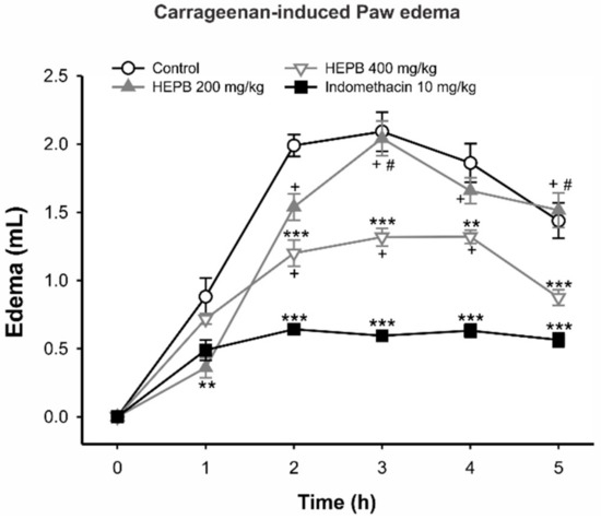 Acute inflammation was produced in the male Wistar rats (n = 6 rats per group) as previously described [12] with slight modifications. Briefly, animals were fasted for 2 h and treated with vehicle, HEPB (200 mg/kg and 400 mg/kg) or indomethacin (10 mg/kg, by gavage). One hour later, animals received intraplantar injections of 100 µL of carrageenan (1%, w/v) in the right hind paw and the same volume of saline (0.9%) in the contra lateral paw. Edema was measured with a plethysmometer (Model 7140, Ugo Basile, Monvalle, Italy) at times 0 (immediately after), 1, 2, 3, 4 and 5 h after intraplantar injection. Results are presented as the change in paw volume (mL) of the right paw in relation to the left paw volume.