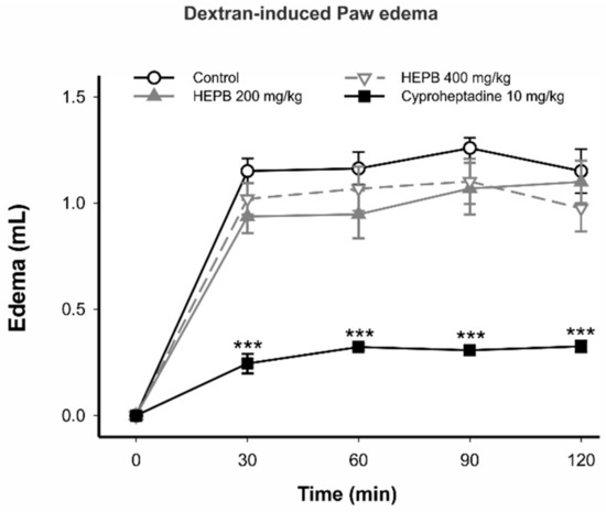 Effects of treatment with HEPB on the dextran-induced paw edema in rats. Groups: control (vehicle); HEPB at 200 mg/kg and 400 mg/kg (orally); Cyproheptadine 10 mg/kg (orally). Results expressed as mean ± S.E.M. of edema volume (n = 5 per group). *** p < 0.001 versus control group. Repeated measures one-way ANOVA, followed by Bonferroni post hoc test.