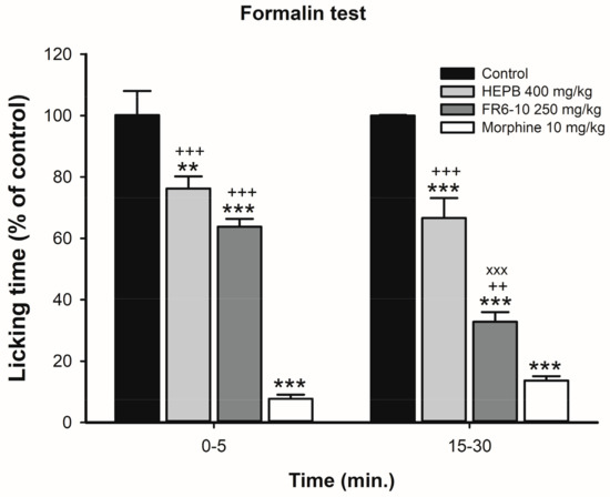 Effects of treatment with HEPB on neurogenic (0–5 min) and inflammatory (15–30 min) phases of the formalin test. Groups: Control (vehicle); HEPB 400 mg/kg (orally); fractions from FR6 to FR10 (FR6-10) 250 mg/kg; and morphine 10 mg/kg (subcutaneously). Results expressed as mean ± S.E.M. of licking time (n = 6–8 per group). ** p < 0.01 versus control group; *** p < 0.001 versus control group; ++ p < 0.01 versus Morphine group; +++ p < 0.001 versus Morphine group; xxx p < 0.001 versus HEPB 400 mg/kg group. One-way ANOVA, followed by Bonferroni post hoc test.