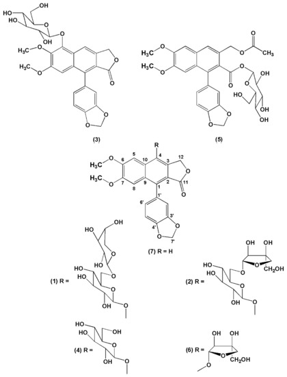 - Al-Abed, Y.; Sabri, S.; Zarga, M.A.; Shah, Z.; Atta-ur-Rahman, A. Chemical constituents of the flora of Jordan, part V-B. Three new arylnaphthalene lignan glucosides from Haplophyllum buxbaumii. J. Nat. Prod. 1990, 53, 1152–1161. [Google Scholar] [CrossRef]