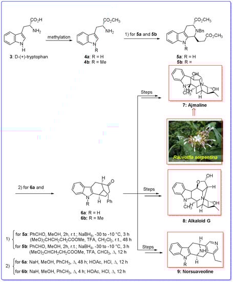 - Li, J.; Wang, T.; Yu, P.; Peterson, A.; Weber, R.; Soerens, D.; Grubisha, D.; Bennett, D.; Cook, J.M. General approach for the synthesis of Ajmaline/Sarpagine Indole alkaloids: Enantiospecific total synthesis of (+)-Ajmaline, Alkaloid G, and Norsuaveoline via the asymmetric Pictet-Spengler reaction. J. Am. Chem. Soc. 1999, 121, 6998–7010. [Google Scholar] [CrossRef]