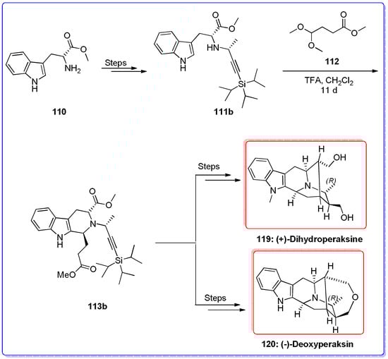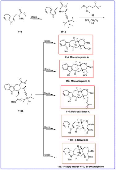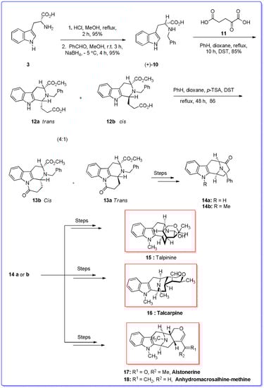 - Yu, P.; Wang, T.; Li, J.; Cook, J.M. Enantiospecific total synthesis of the Sarpagine related indole alkaloids Talpinine and Talcarpine as well as the improved total synthesis of Alstonerine and Anhydromacrosalhine-methine via the asymmetric Pictet-Spengler reaction. J. Org. Chem. 2000, 65, 3173–3191. [Google Scholar] [CrossRef] [PubMed]