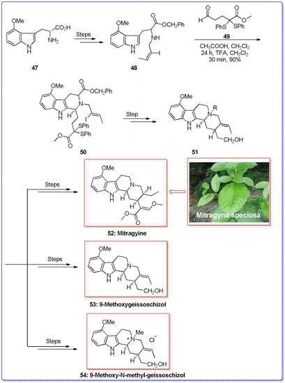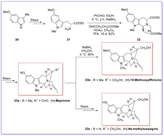 - Rahman, M.T.; Deschamps, J.R.; Imler, G.H.; Cook, J.M. Total synthesis of Sarpagine-related bioactive indole alkaloids. Chem. A Eur. J. 2017. [Google Scholar] [CrossRef] [PubMed]