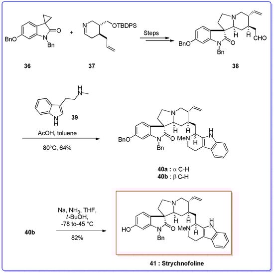 - Yu, Q.; Guo, P.; Jian, J.; Chen, Y.; Xu, J. Nine-step total synthesis of (−)-Strychnofoline. Chem. Commun. 2018, 54, 1125–1128. [Google Scholar] [CrossRef] [PubMed]