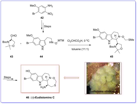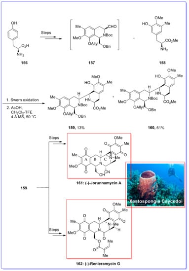 - Chen, R.; Liu, H.; Chen, X. Asymmetric total synthesis of (−)-jorunnamycins A and C and (−)-jorumycin from L-tyrosine. J. Nat. Prod. 2013, 76, 1789–1795. [Google Scholar] [CrossRef] [PubMed]