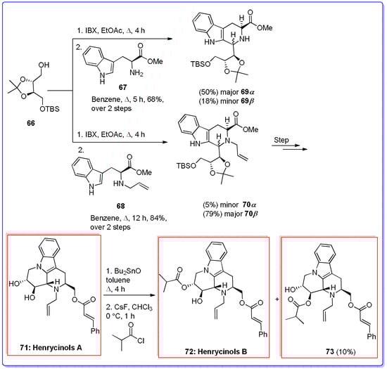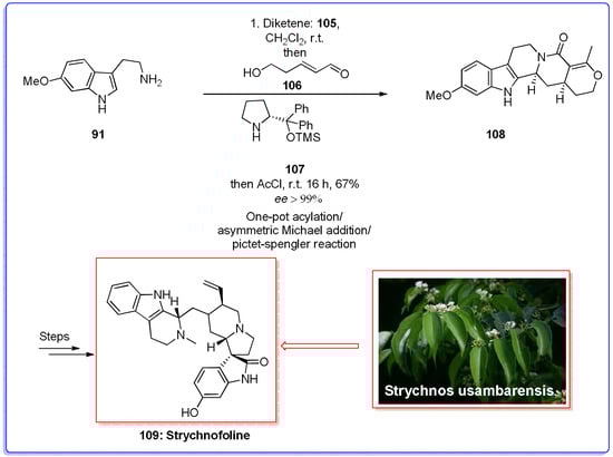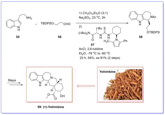 - Herlé, B.; Wanner, M.J.; van Maarseveen, J.H.; Hiemstra, H. Total synthesis of (+)-Yohimbine via an enantioselective organocatalytic Pictet–Spengler reaction. J. Org. Chem. 2011, 76, 8907–8912. [Google Scholar] [CrossRef] [PubMed]
