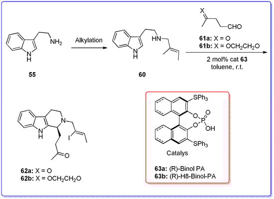 - Mittal, N.; Sun, D.X.; Seidel, D. Conjugate-base-stabilized brønsted acids: Catalytic enantioselective Pictet–Spengler reactions with unmodified Tryptamine. Org. Lett. 2014, 16, 1012–1015. [Google Scholar] [CrossRef] [PubMed]