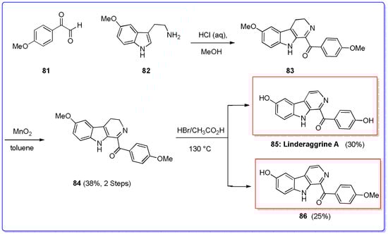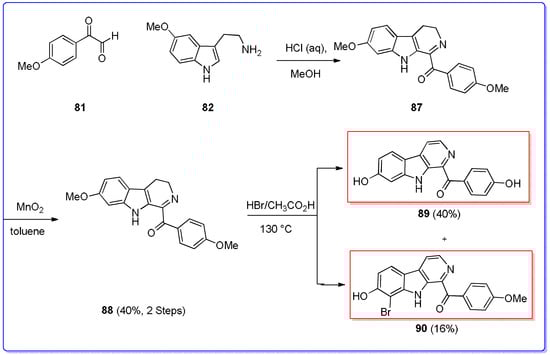 - Soerens, D.; Sandrin, J.; Ungemach, F.; Mokry, P.; Wu, G.S.; Yamanaka, E.; Hutchins, L.; DiPierro, M.; Cook, J.M. Study of the Pictet–Spengler reaction in aprotic media: Synthesis of the β-Galactosidase inhibitor, Pyridindolol. J. Org. Chem. 1979, 44, 535–545. [Google Scholar] [CrossRef]