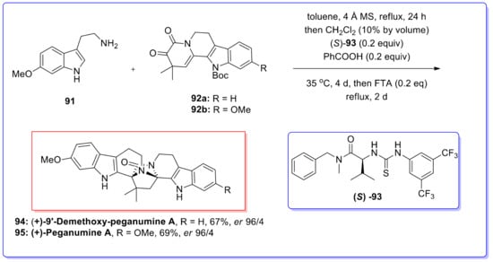 - Klausen, R.S.; Jacobsen, E.N. Weak Brønsted acid−thiourea co-catalysis: Enantioselective, Catalytic Protio-Pictet−Spengler reactions. Org. Lett. 2009, 11, 887–890. [Google Scholar] [CrossRef] [PubMed]