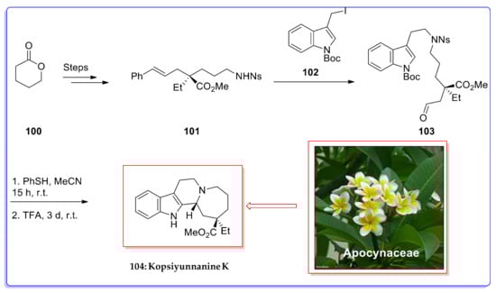 - Tokuda, R.; Okamoto, Y.; Koyama, T.; Kogure, N.; Kitajima, M.; Takayama, H. Asymmetric total synthesis of Kopsiyunnanine K, A monoterpenoid indole alkaloid with a rearranged skeleton. Org. Lett. 2016, 18, 3490–3493. [Google Scholar] [CrossRef] [PubMed]