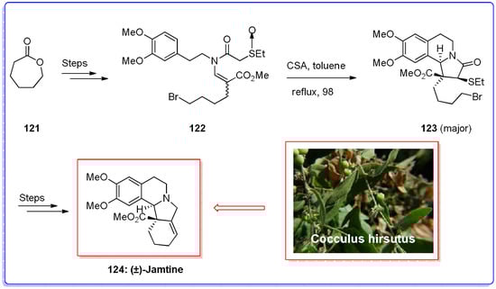 - Padwa, A.; Danca, M.D. Total synthesis of (±)-jamtine using a thionium/N-acyliminium ion Cascade. Org. Lett. 2002, 4, 715–717. [Google Scholar] [CrossRef] [PubMed]