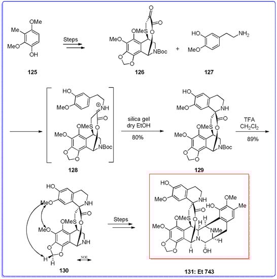 - Corey, E.J.; Gin, D.Y.; Kania, R.S. Enantioselective total synthesis of Ecteinascidin 743. J. Am. Chem. Soc. 1996, 118, 9202–9203. [Google Scholar] [CrossRef]