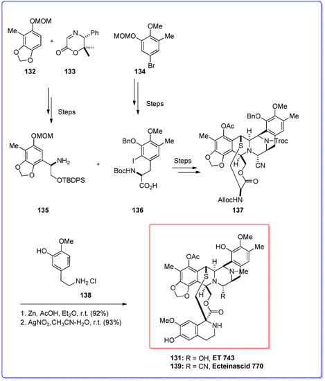 - Endo, A.; Yanagisawa, A.; Abe, M.; Tohma, S.; Kan, T.; Fukuyama, T. Total synthesis of Ecteinascidin 743. J. Am. Chem. Soc. 2002, 124, 6552–6554. [Google Scholar] [CrossRef] [PubMed]