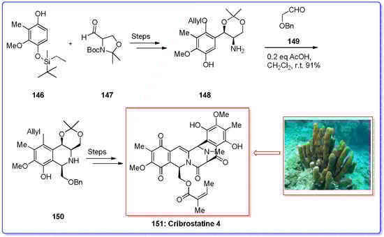 - Vincent, G.; Williams, R.M. Asymmetric total synthesis of (−)-cribrostatin 4 (Renieramycin H). Angew. Chem. Int. Ed. 2007, 46, 1517–1520. [Google Scholar] [CrossRef] [PubMed]