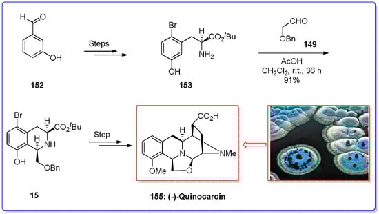 - Wu, Y.-C.; Liron, M.; Zhu, J. Asymmetric total synthesis of (−)-quinocarcin. J. Am. Chem. Soc. 2008, 130, 7148–7152. [Google Scholar] [CrossRef] [PubMed]