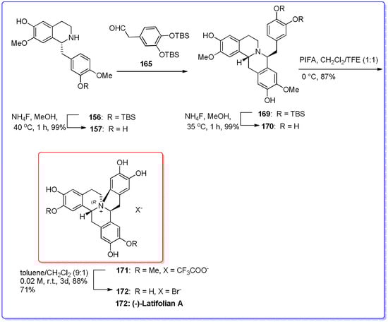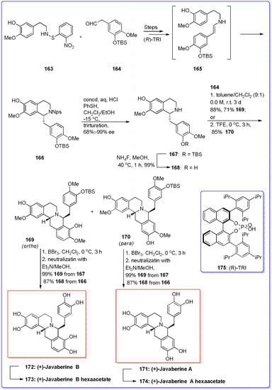 - Kayhan, J.; Wanner, M.J.; Ingemann, S.; van Maarseveen, J.H.; Hiemstra, H. Consecutive Pictet–Spengler condensations toward bioactive 8-benzylprotoberberines: Highly selective total syntheses of (+)-javaberine A, (+)-javaberine B, and (−)-latifolian A. Eur. J. Org. Chem. 2016, 2016, 3705–3708. [Google Scholar] [CrossRef]