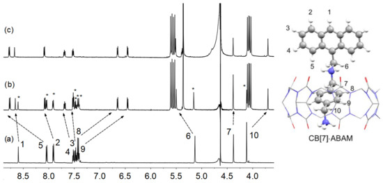 The fluorescence indicator ABAM (as HCl salt) was synthesized by the reaction of 9-(chloromethyl) anthracene with 1,4-di(aminomethyl) benzene (Scheme 2 in Section 3). The binding between ABAM (as HCl salt) and CB[7] was first investigated by 1H NMR spectroscopy in D2O (Figure 2). As shown in Figure 2b, when the molar ratio between ABAM and CB[7] was 2:1, both free and bound peaks of ABAM molecule were observed, indicating the complexation-decomplexation processes between ABAM and CB[7] is slow exchange kinetics on the 1H NMR time scale. The resonance signals of H8, H9, as well as H10 protons shifted upfield significantly (Δδ = 0.79 ppm, 0.96 ppm, and 0.42 ppm respectively), suggesting the encapsulation of the 4-aminomethyl-benzyl moieties in the cavity of CB[7]. The signals of H5 and H6 protons shifted downfield significantly because of their location in the de-shielding region of CB[7]. The slight downfield shifts of H1-4 proton signals is caused by weakened π−π stacking interactions between anthracene moieties upon the encapsulation of ABAM in CB[7] [43]. Adding more than 1 eq. of CB[7] did not induce further chemical shifts of ABAM proton signals, indicating the 1:1 host-guest complexation between the indicator and CB[7]. Based on this, a plausible schematic configuration of the inclusion complex CB[7]·ABAM is given in Figure 2. Further, association constants of the CB[7]·ABAM complex as high as 8.7 × 108 M−1 were obtained by 1H NMR competition experiment (Figure S4 and Table S1) [37].