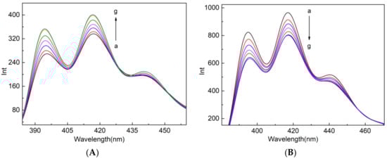 (A) Fluorescence spectra of the ABAM with addition of CB[7]: (a) 0; (b) 0.2 eq.; (c) 0.4 eq.; (d) 0.6 eq.; (e) 0.8 eq.; (f) 1.0 eq.; (g) 1.2 eq. ([ABAM] = 2 μM, pH = 4.70, λex/λem = 366/417 nm, the excitation and emission monochromator bandpasses were set at 15 nm and 3 nm, respectively). (B) Fluorescence spectra of the ABAM in the presence of CB[7] with addition of AMA: (a) 0; (b) 0.2 eq.; (c) 0.4 eq.; (d) 0.6 eq.; (e) 0.8 eq.; (f) 1.0 eq.; (g) 1.2 eq. ([CB[7]·ABAM] = 0.2 μM, pH = 4.70, λex/λem = 366/417 nm, the excitation and emission monochromator bandpasses were set at 10 nm and 6 nm, respectively).